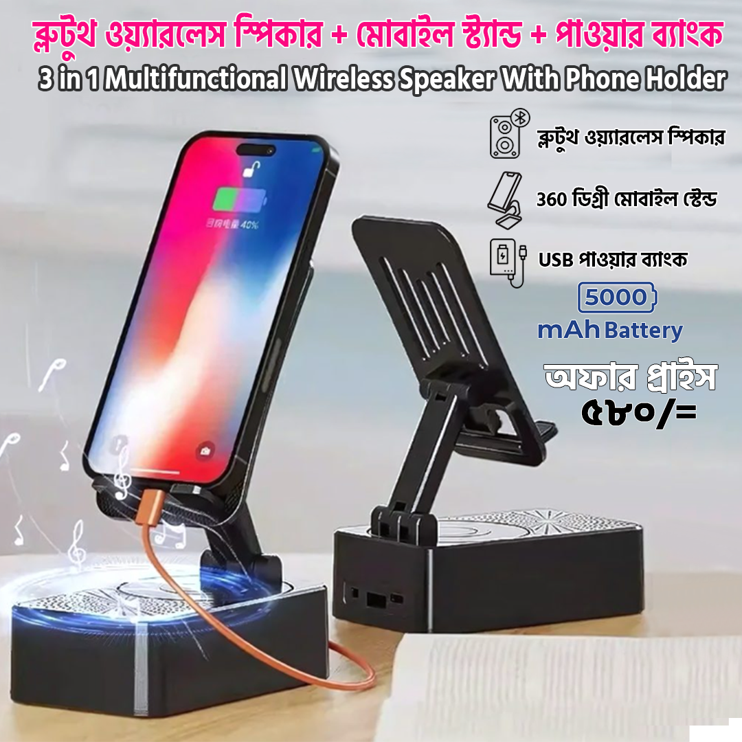 ব্লুটুথ ওয়্যারলেস স্পিকার + মোবাইল স্ট্যান্ড + পাওয়ার ব্যাংক